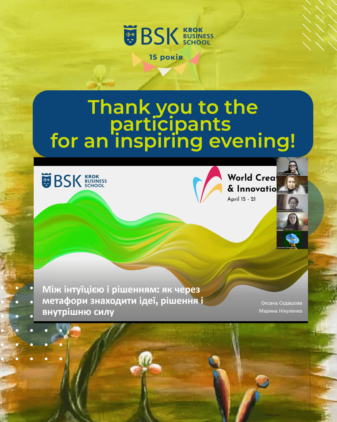 In 2026, KROK Business School celebrated World Creativity and Innovation Week by organizing and hosting a special evening — a webinar–workshop titled “Between Intuition and Decision: Finding Ideas, Solutions, and Inner Strength Through Metaphors.”