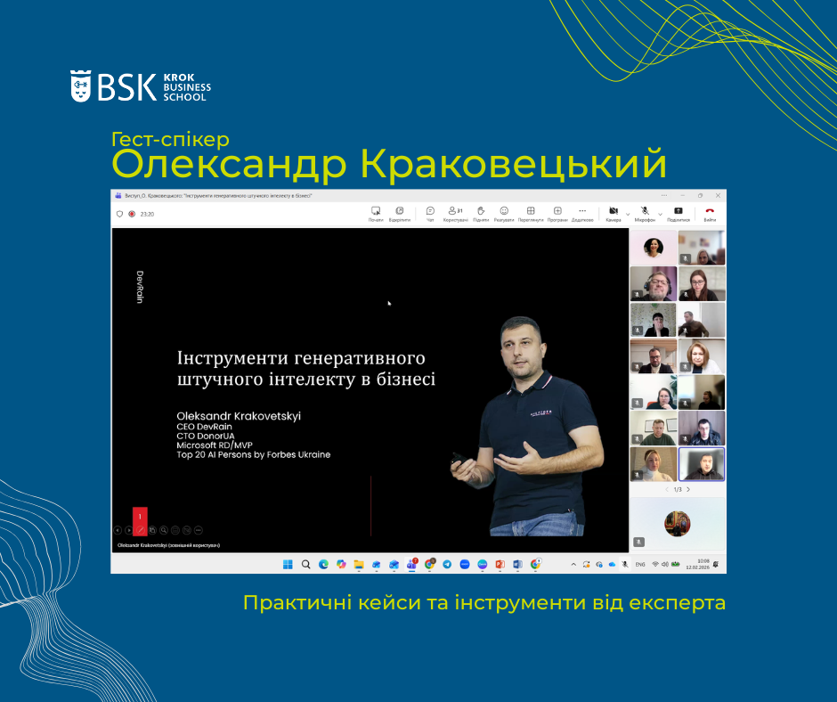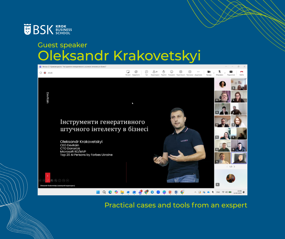 On February 12, an online session was held with guest speaker Oleksandr Krakovetskyi on the topic “Generative Artificial Intelligence Tools in Business.”
