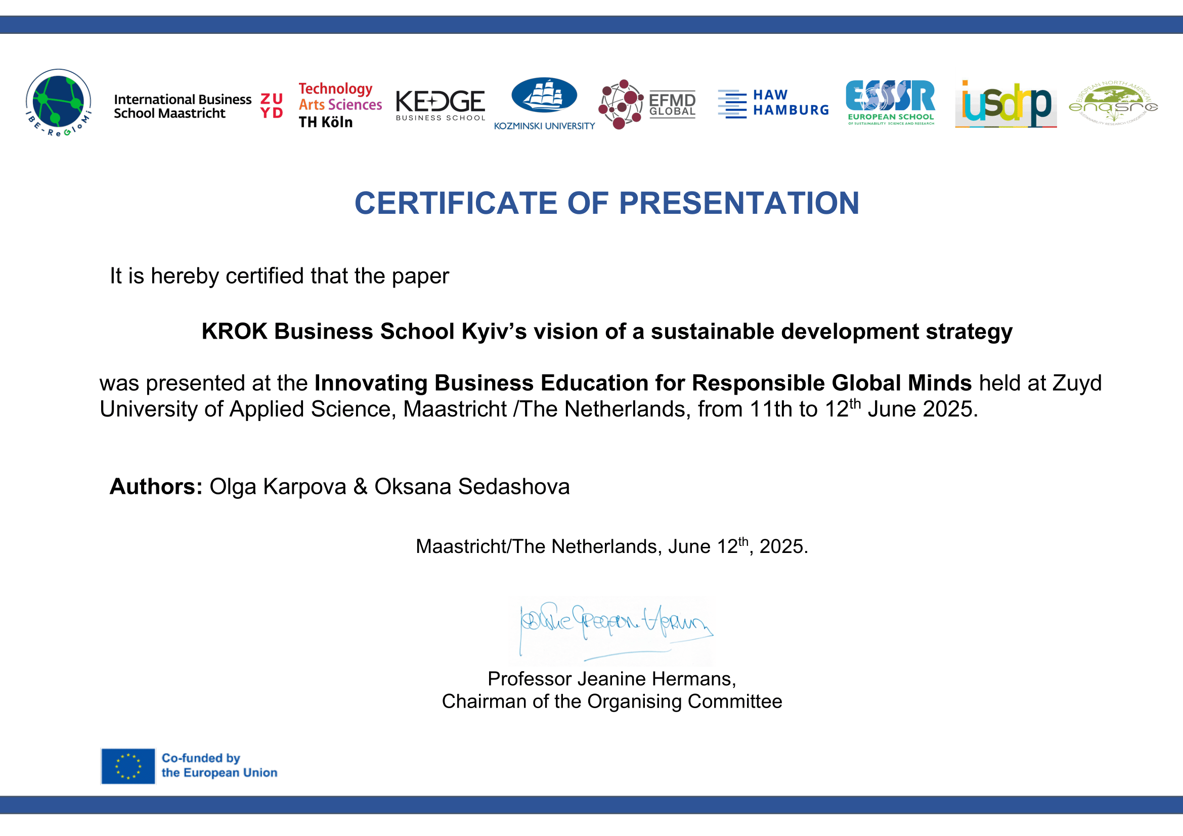 The high quality of the Ukrainian presentation was noted by conference participants, who expressed genuine interest in the approaches shared and showed readiness for further collaboration. KROK Business School continues to integrate European standards into its educational process, shaping responsible global citizens and fostering international dialogue for a better future.