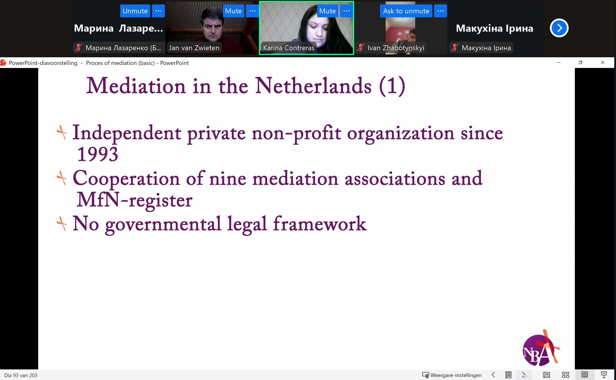 On October 30 and November 4, 2025, Professor Jan van Zwieten, President of the Netherlands Business Academy, delivered a series of lectures on the topic “Mediation in the Netherlands” for participants of three programs titled “Basic Skills of a Mediator.” During the sessions, Professor van Zwieten shared practical experience in applying mediation across various fields and highlighted the importance of mediation in Ukraine’s post-war recovery.
