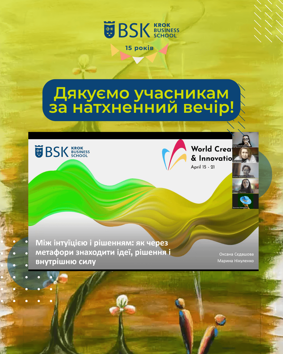 В 2026 році Бізнес Школа КРОК відзначила Всесвітній тиждень креативності та інновацій організувавши і провівши особливий вечір - вебінар-воркшоп «Між інтуїцією і рішенням: як через метафори знаходити ідеї, рішення і внутрішню силу».