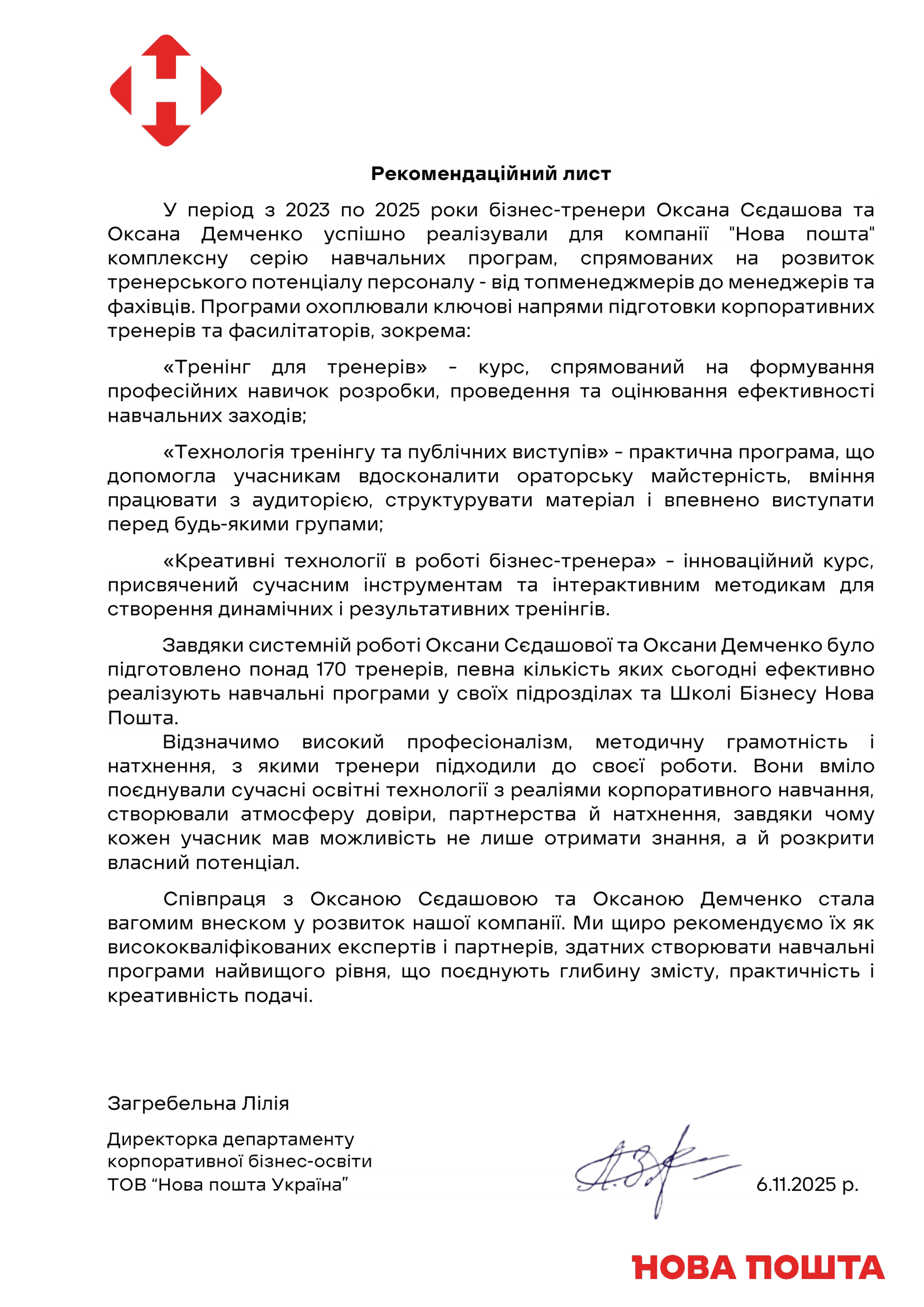 «Сегодня встретились с Владимиром, обсудили прошедший тренинг. Владимир остался доволен результатами, говорит, что точно попали в цель с программой и с Вами, как преподавателем. Мы продолжительное время искали на рынке подходящую программу и получилось не зря, так как продукт оказался индивидуальным, авторским, как раз под аудиторию заказчика. В связи с этим хочу Вас поблагодарить за системный основательный подход к подготовке программы и работу на тренинге.»